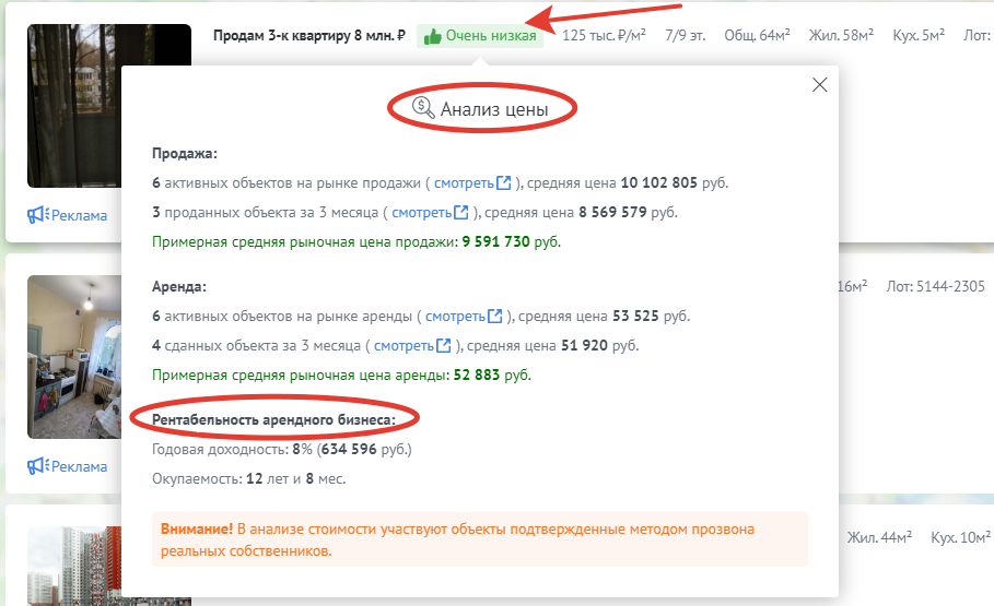 С помощью него вам будет доступна информация о максимально похожих объектах на рынке продажи и аренды, как актуальных в настоящий момент, так и проданных/сданных ранее, а также данные о рентабельности арендного бизнеса на основании среднестатистических данных по похожим объектам.